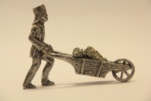 Zinnfigur "Erzkarrenschieber"; ca 4 cm hoch und 5,5 cm lang. Karre gefüllt nach Wunsch mit Pyrit, Quarz oder Amethyst.