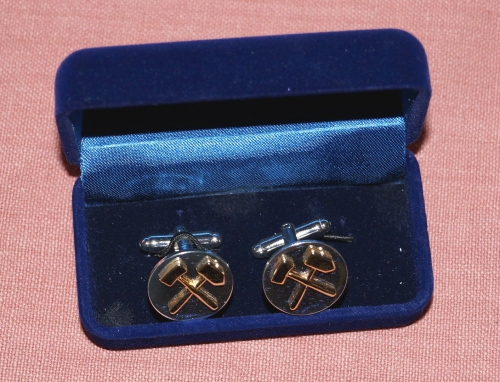 Bergmänische Manschettenknöpfe, verchromt mit Schlägel und Eisen in Messing, Durchmesser 19mm